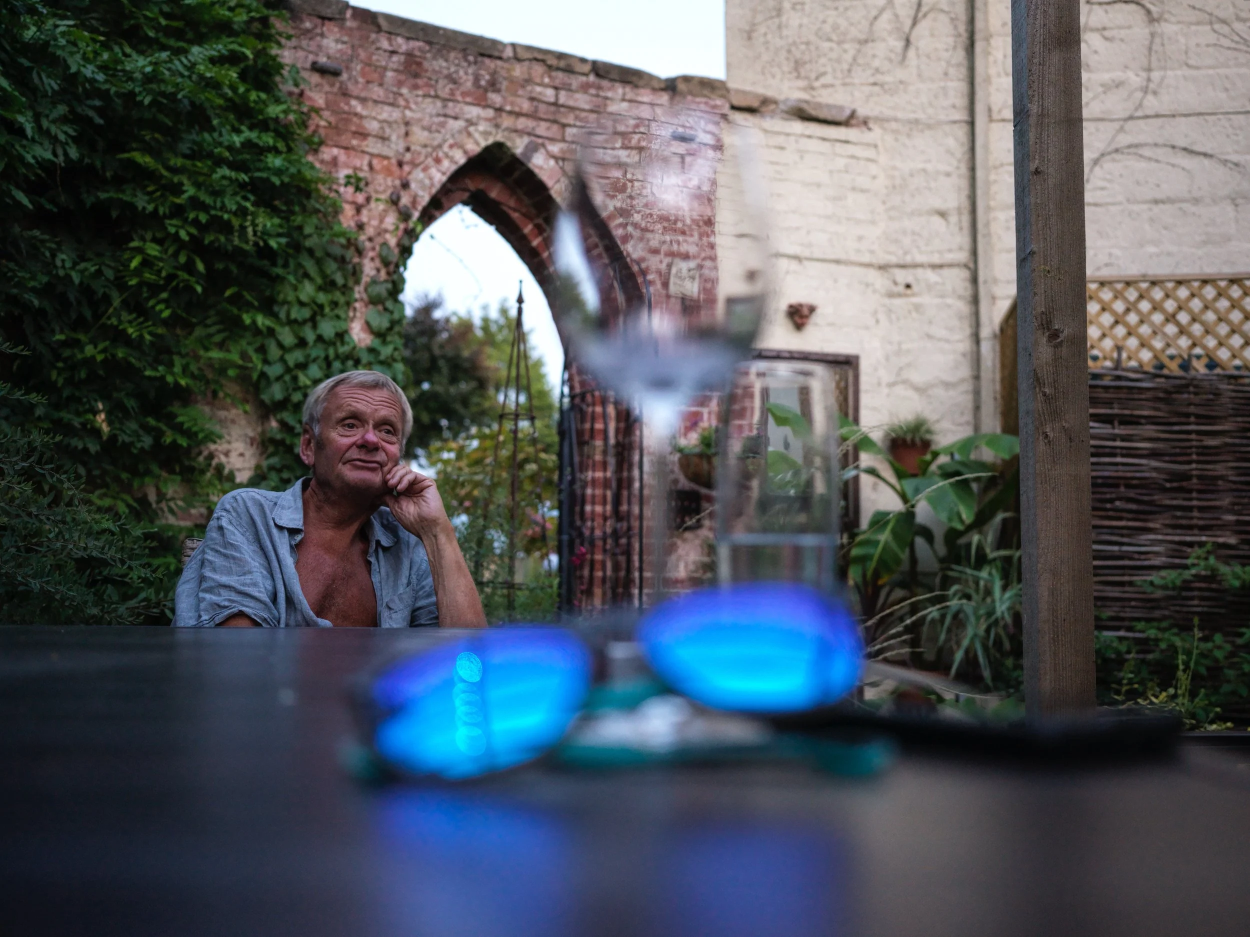 An elderly man sitting outside at a table with a pair of sunglasses and a glass of water, looking thoughtful, with an old brick archway and foliage in the background.