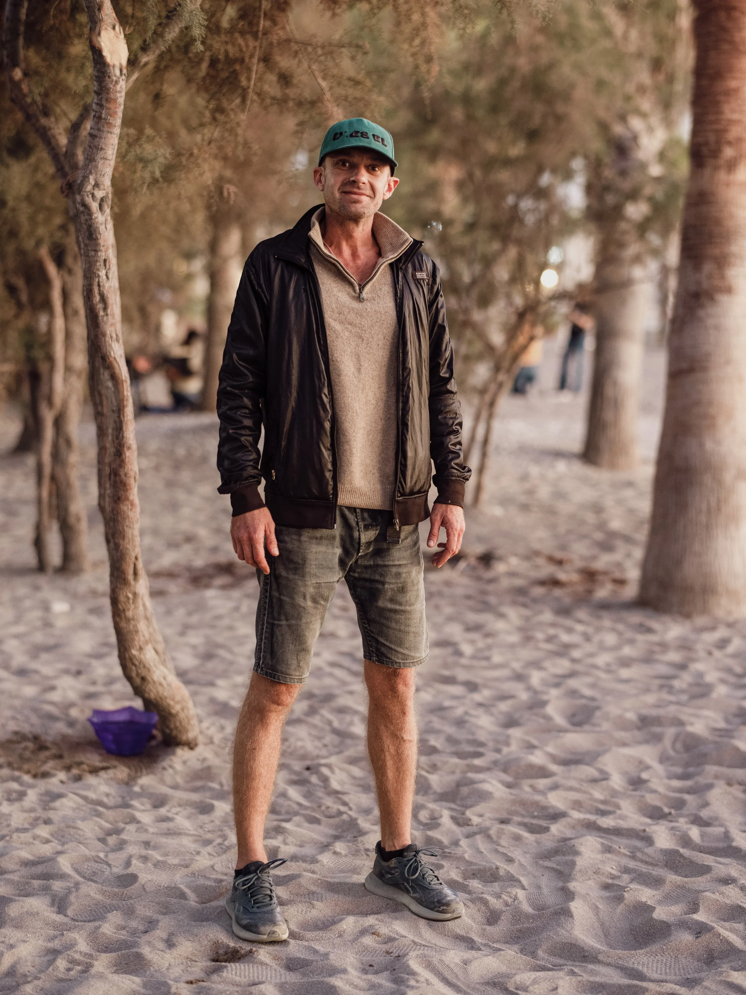 A man standing on a sandy beach among trees, wearing a green cap, beige sweater, black jacket, shorts, and sneakers.