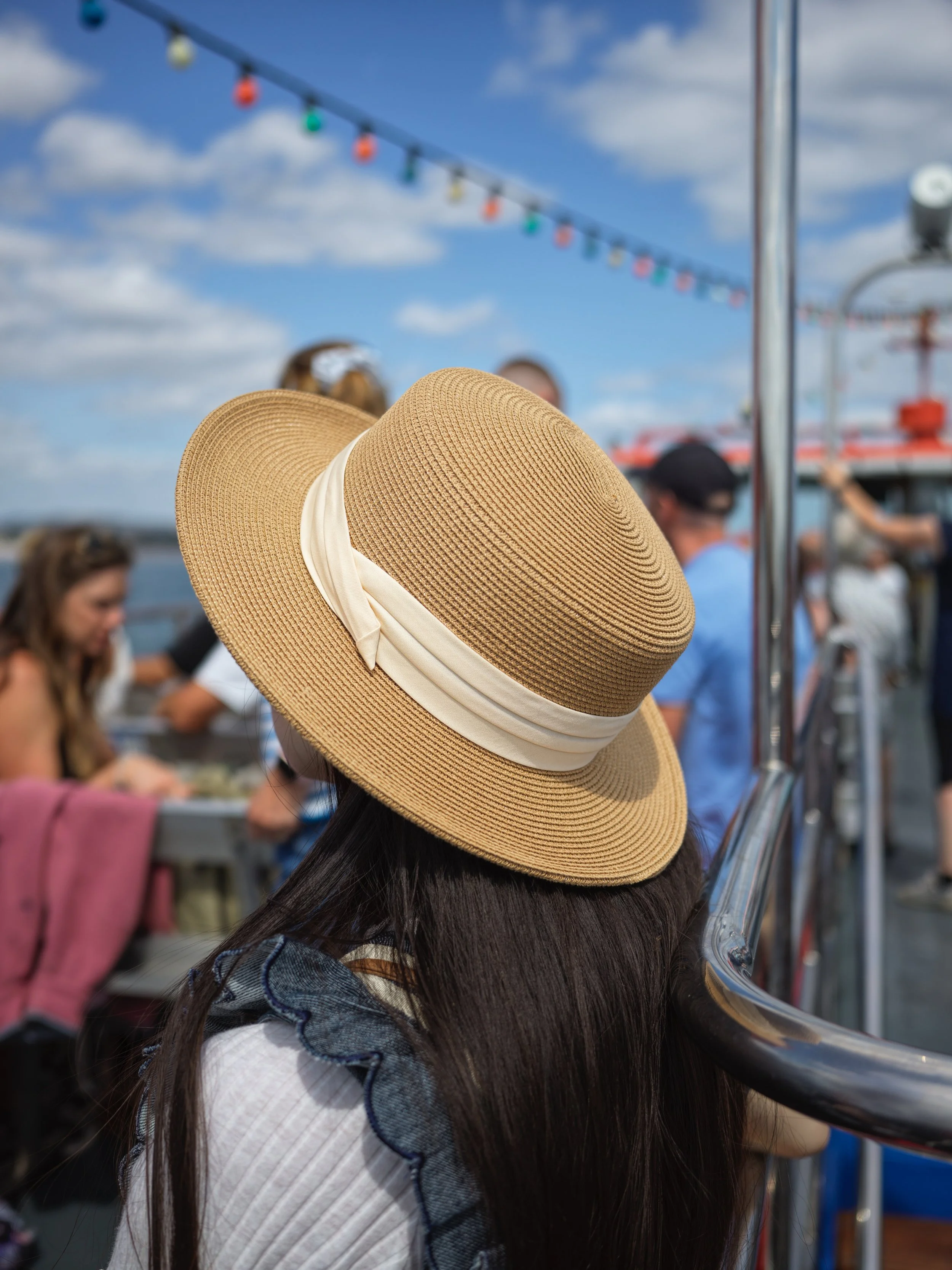 A woman wearing a tan wide-brimmed hat with a beige ribbon, looking out from a boat with other people, with a blue sky and colorful string lights overhead.