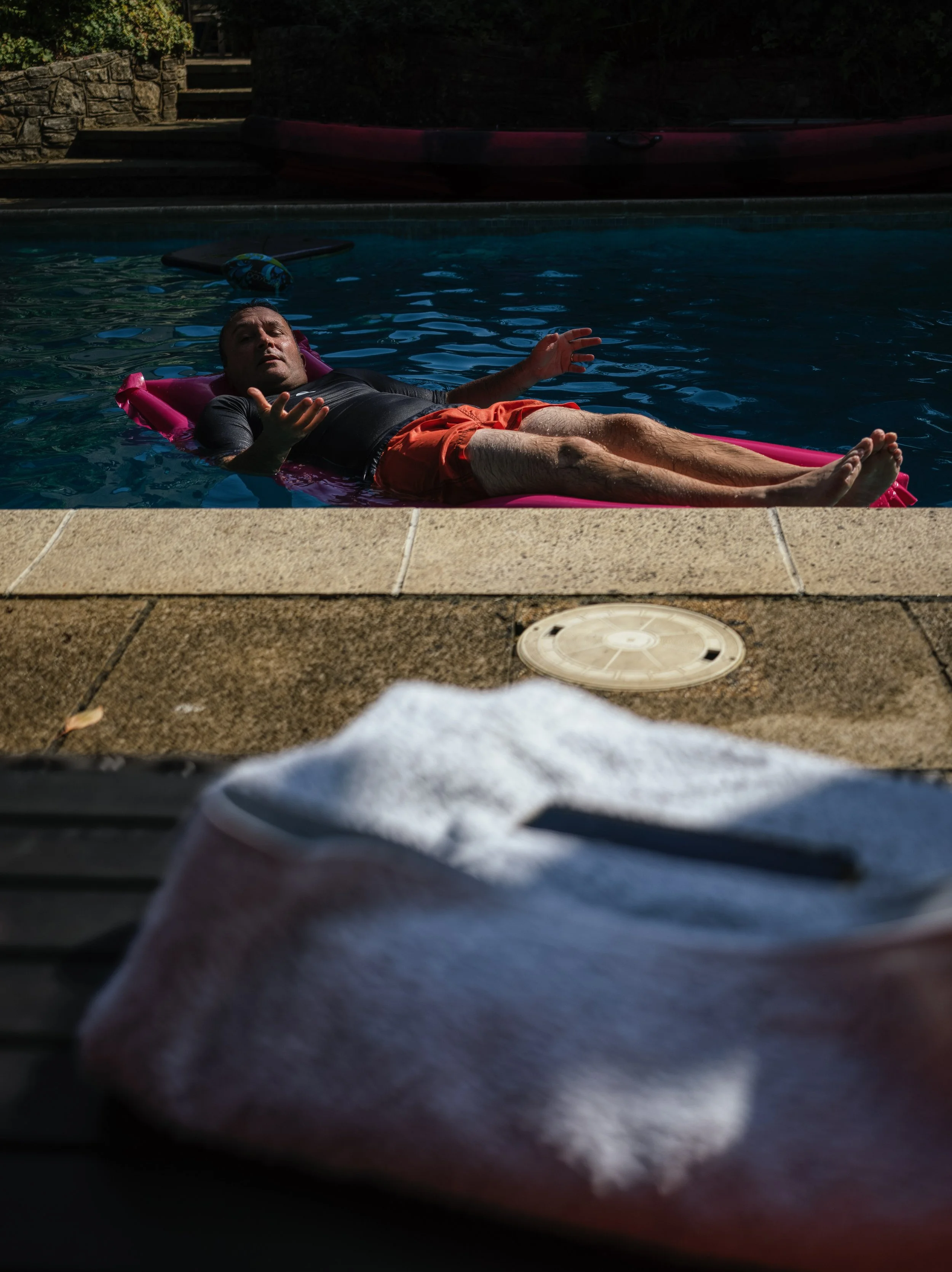 Man floating on a pink pool float in a swimming pool, with a towel and some items on the poolside in the foreground.