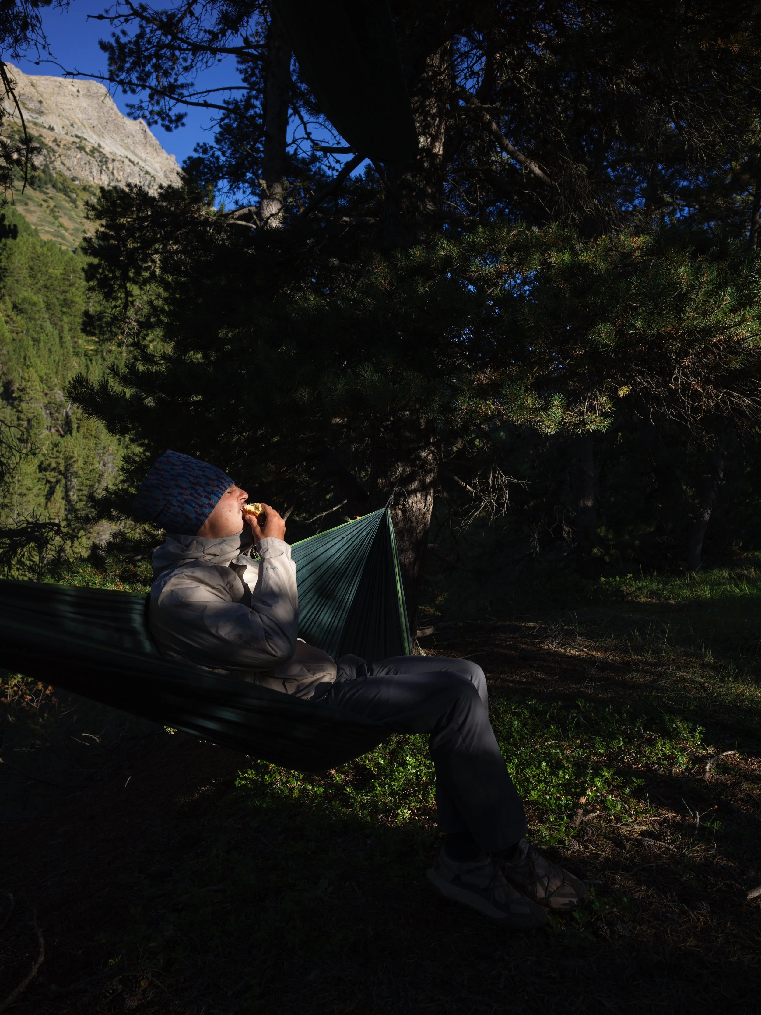 Person relaxing in a hammock while eating outdoors in a forested mountain area.