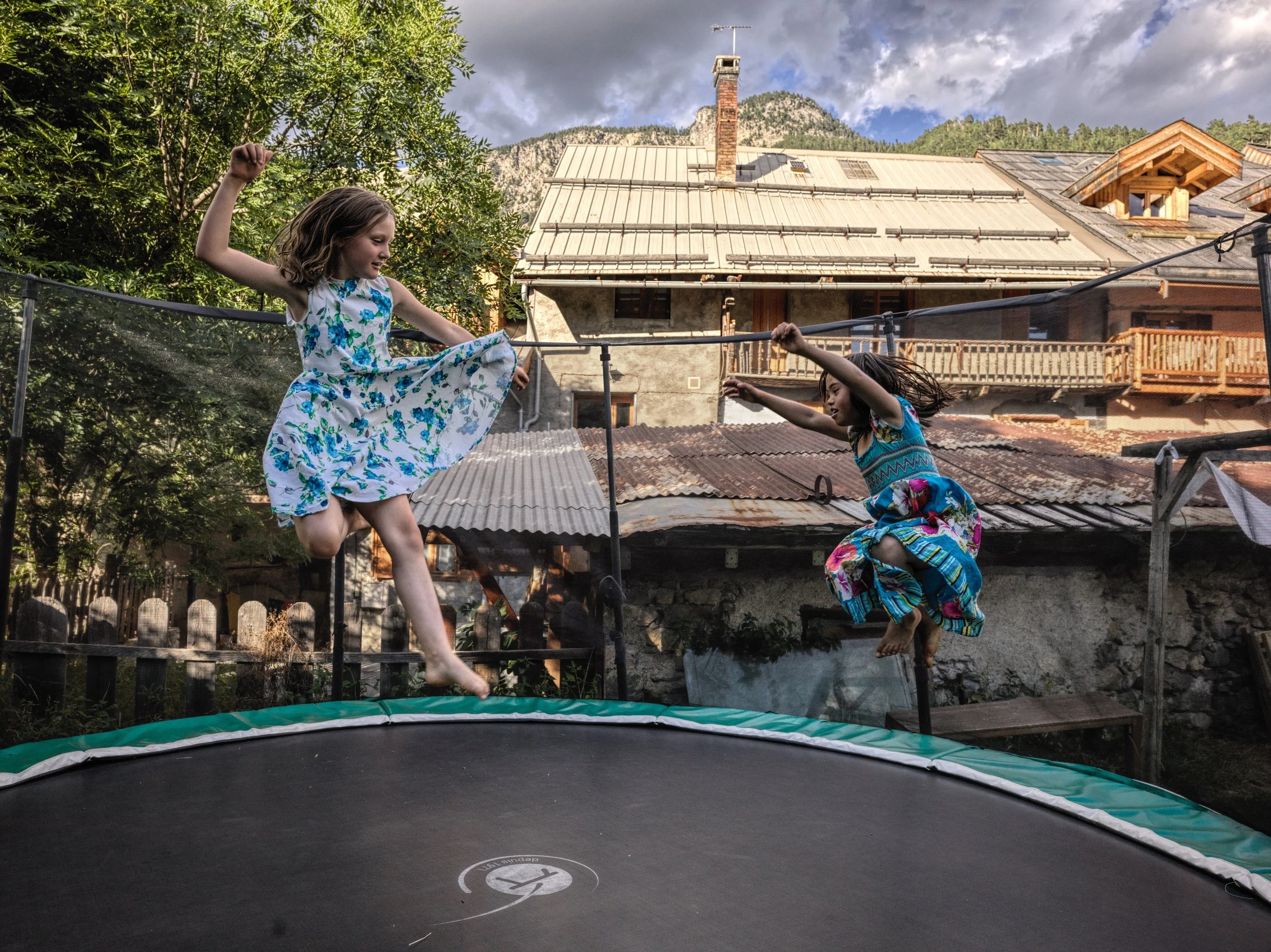 Two young girls in colorful dresses jumping and playing on a trampoline outdoors, with a mountain, trees, and houses in the background.