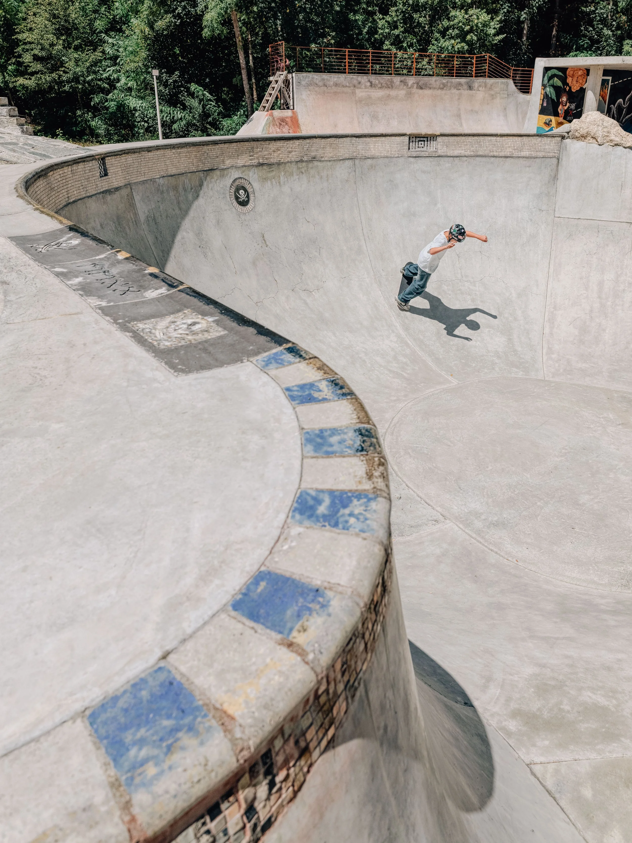 A person skateboarding in a concrete skate park bowl on a sunny day.