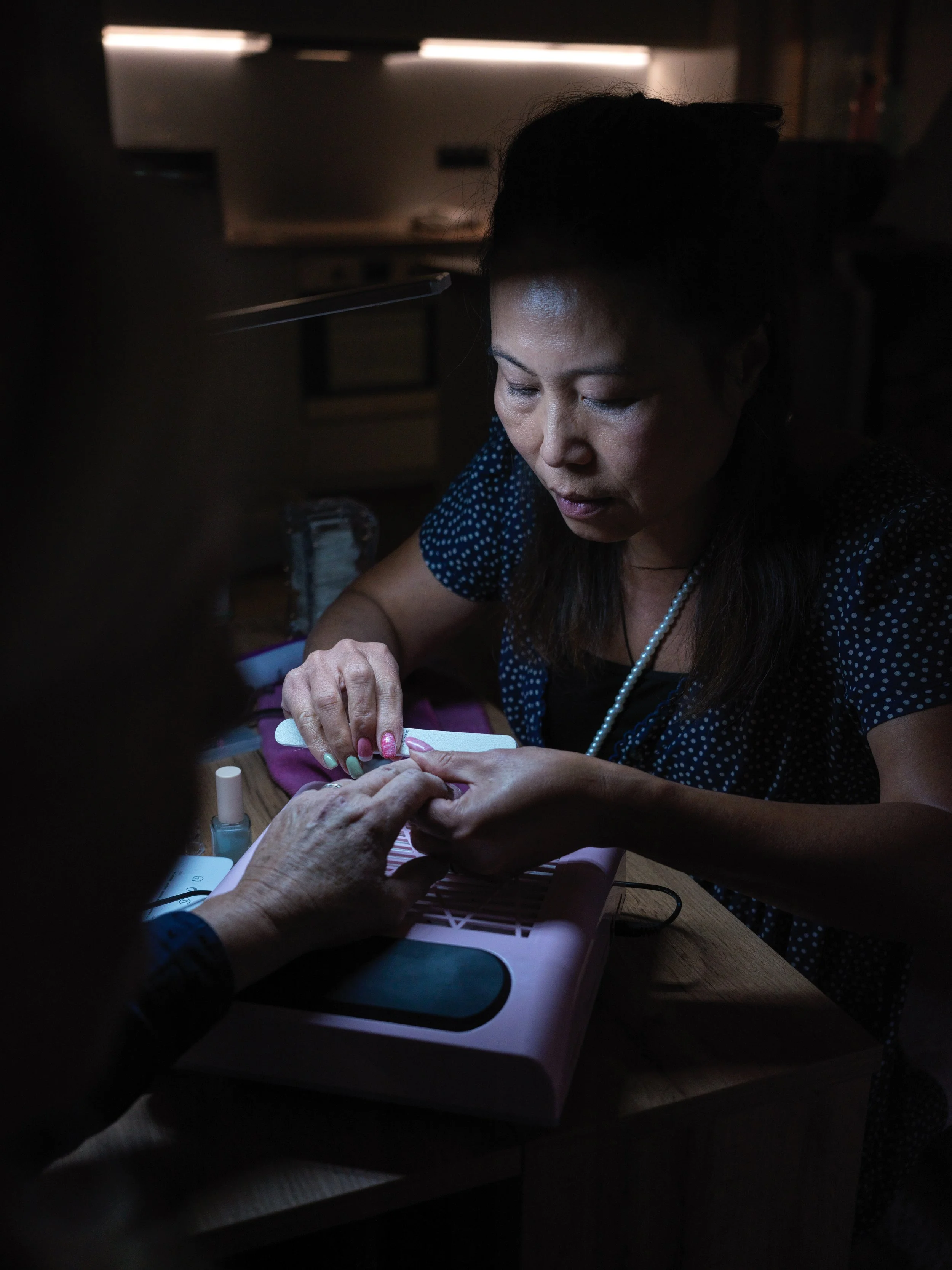 Woman getting a manicure in a dimly lit space, with focus on her hand and the manicure process.