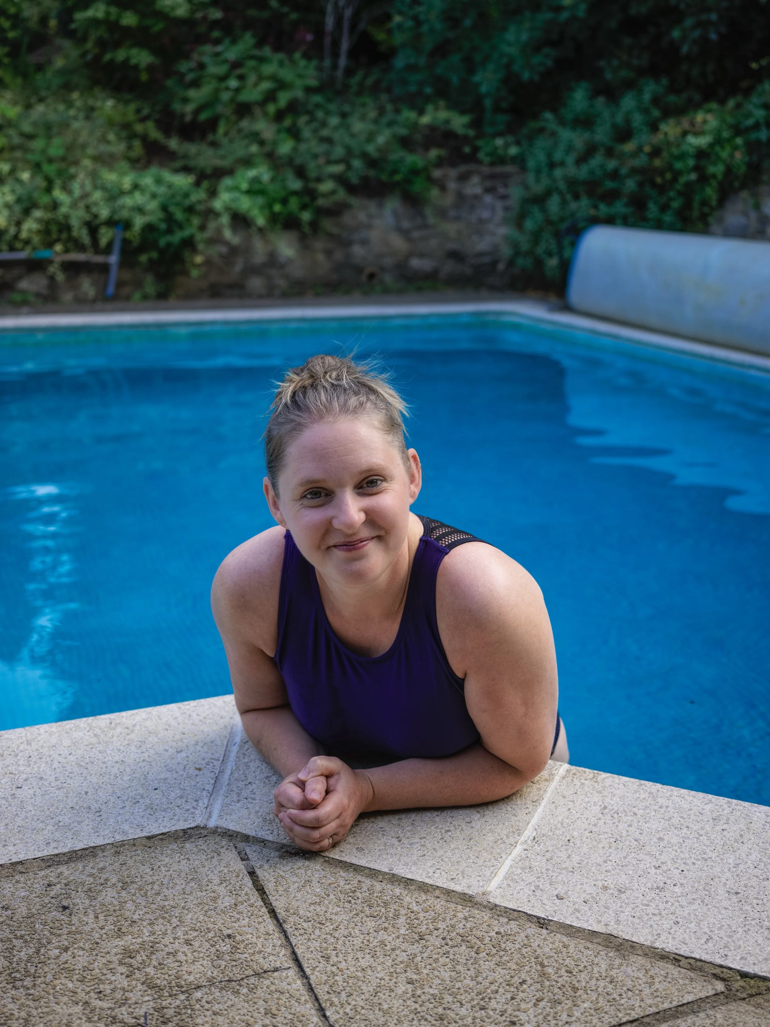 Woman in a purple top relaxing by a backyard swimming pool, leaning on the pool's edge with trees and bushes in the background.