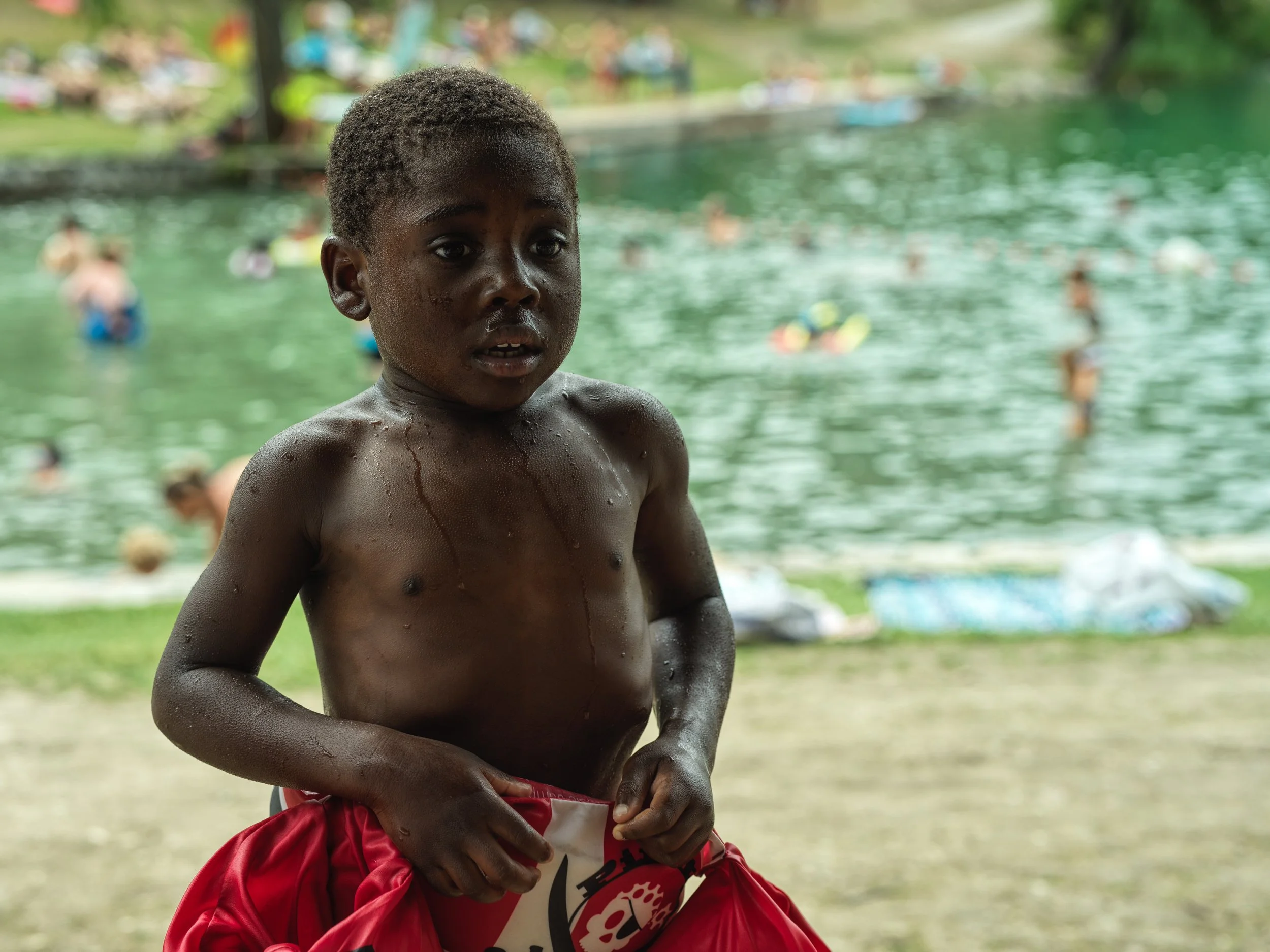 Young boy standing near a swimming pool, with other children swimming in the background.