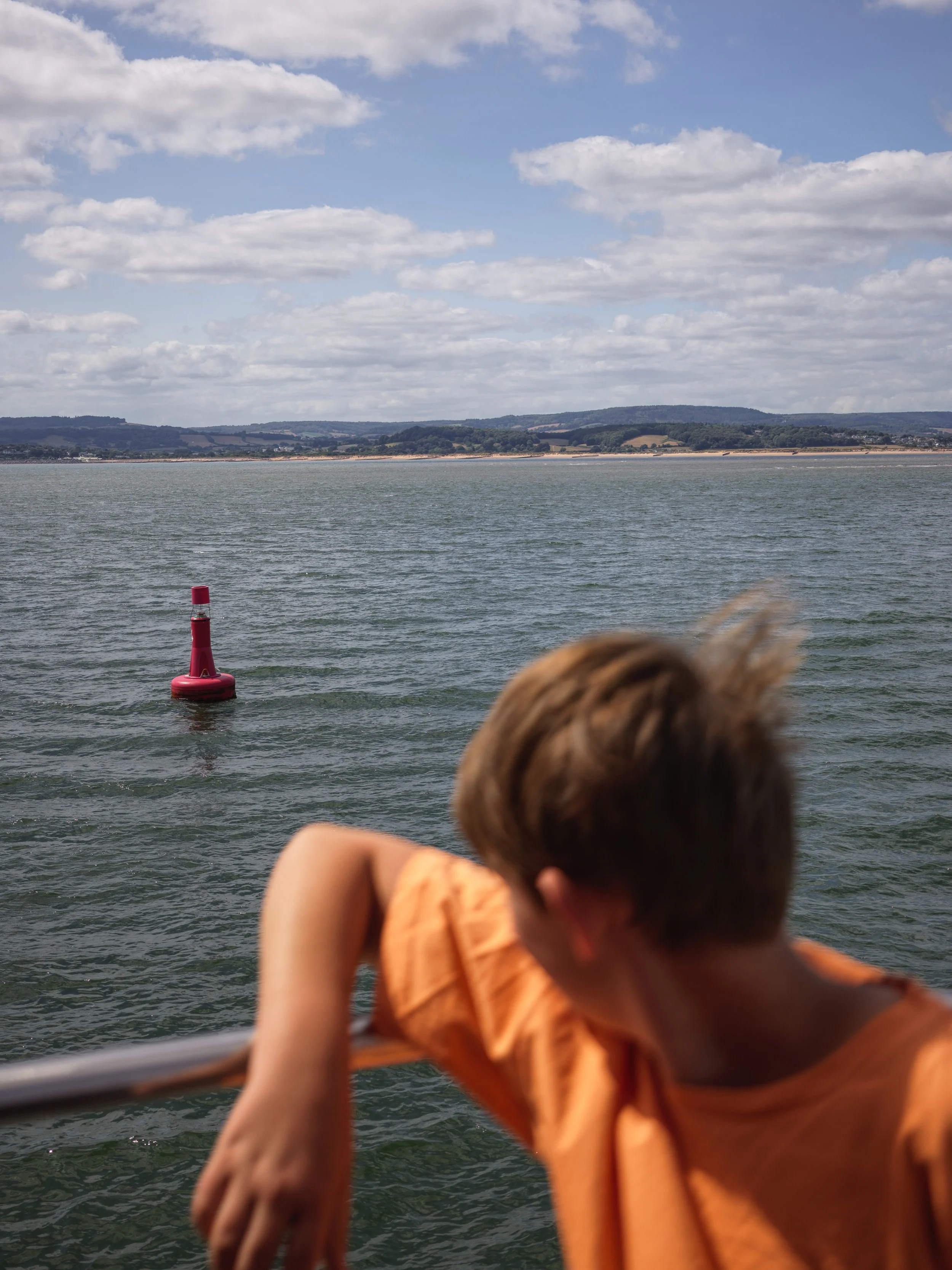 Child wearing an orange shirt leaning over a boat railing, with water, a red buoy, and distant shoreline with hills in the background.