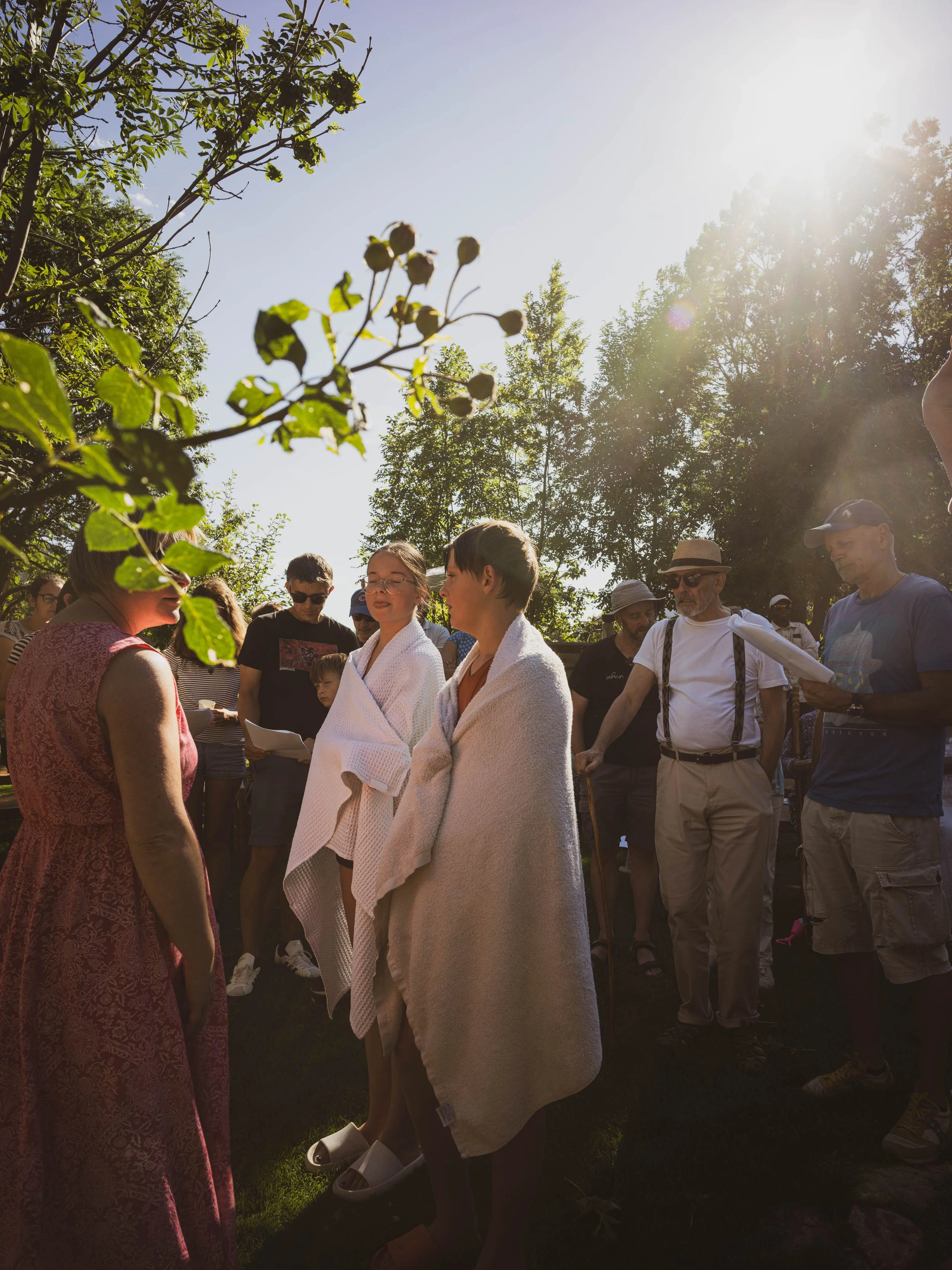 People gathered outdoors in the sunlight, with some wrapped in towels, amid trees and foliage.