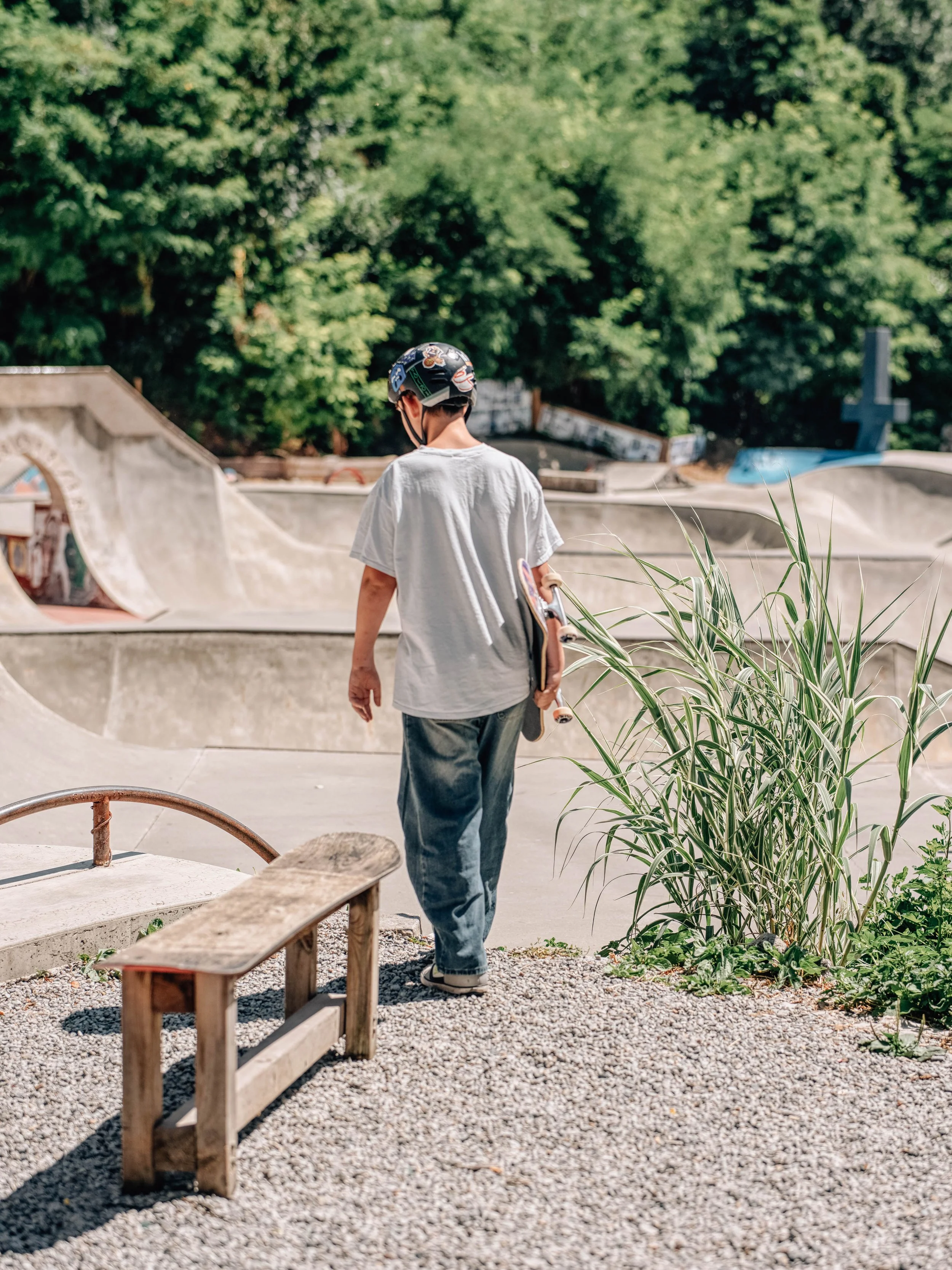 Child wearing a helmet and casual clothes holding a skateboard, walking near a small wooden bench at a concrete skate park with lush green trees in the background.
