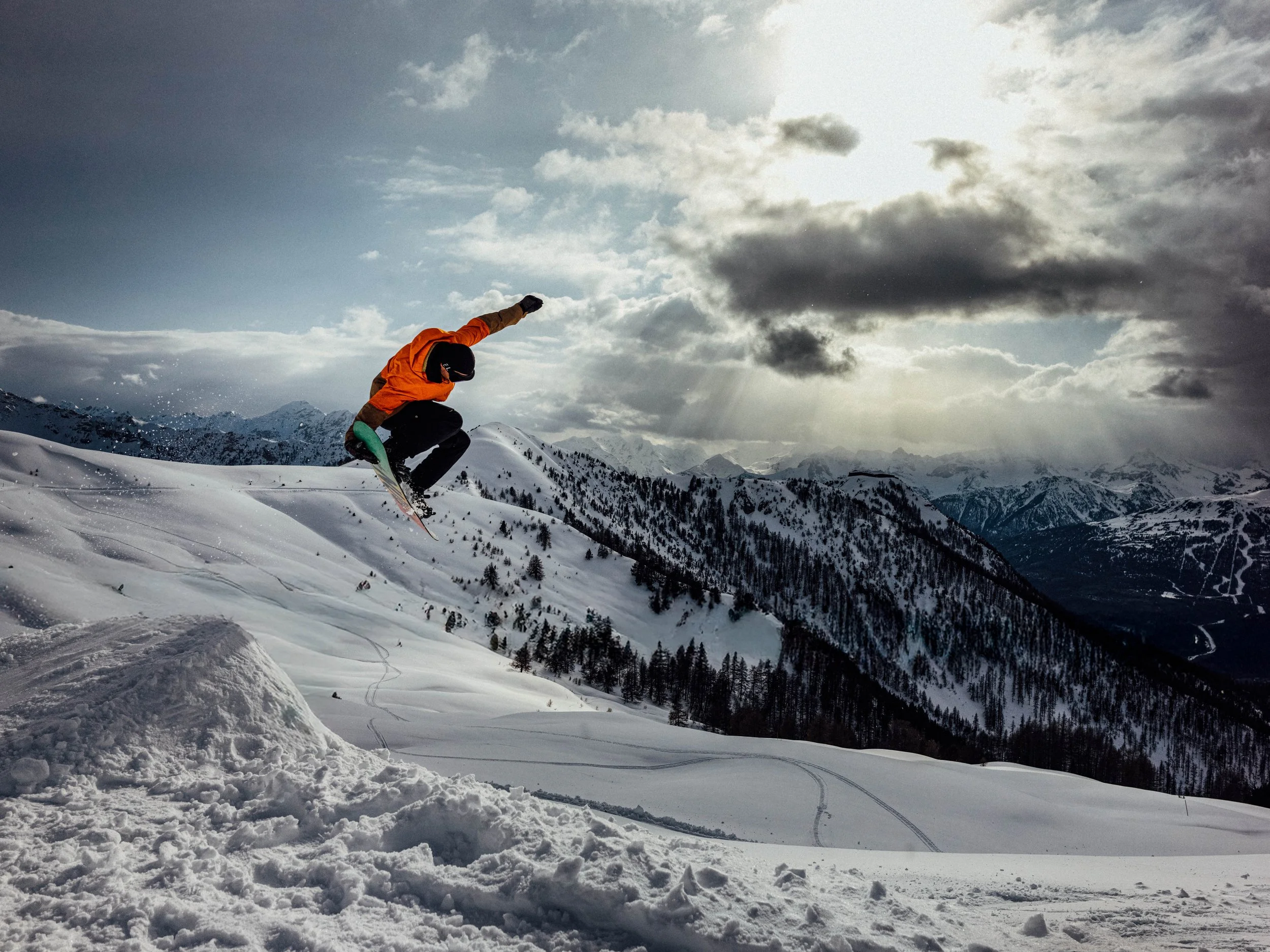 A person in an orange jacket and black pants snowboarding down a snowy mountain slope with a cloudy sky overhead and mountain range in the background.